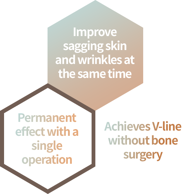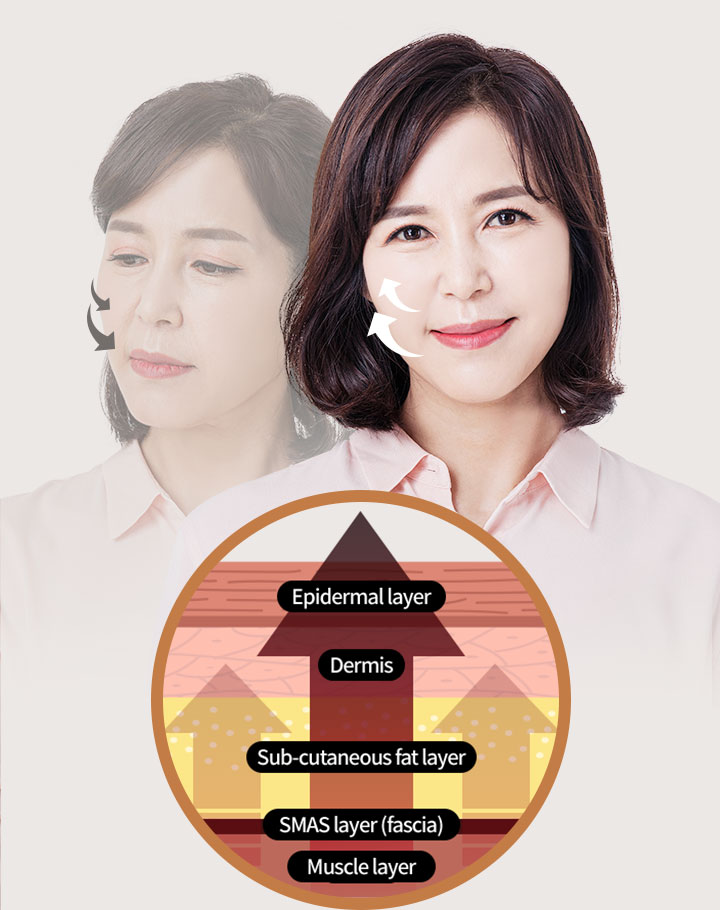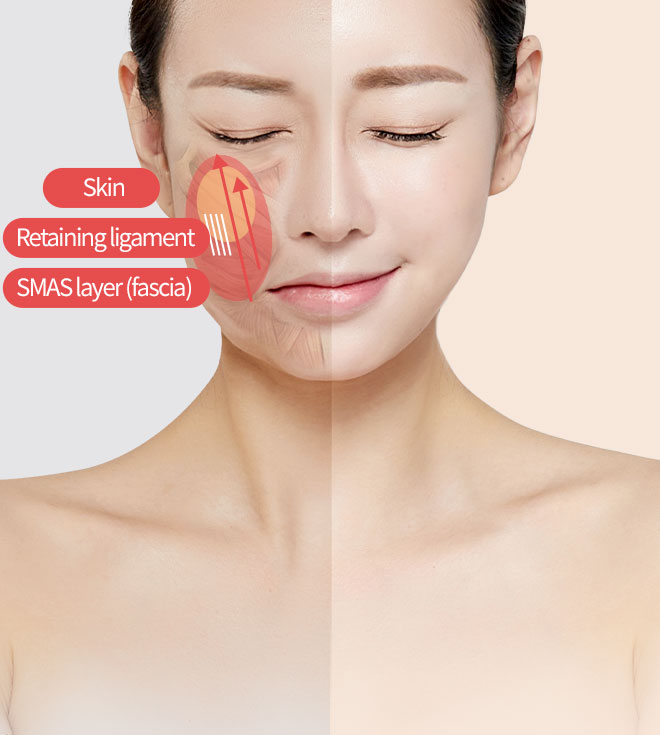 By simultaneously pulling each layer of the face up to the innermost fascia layer that causes sagging to the outermost surface of the skin, the lift effect is superior and lasts longer.
