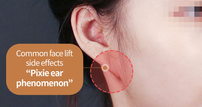 One of the most common face lift side effects is stretched earlobes. To prevent this, it is necessary to lower the skin tension by pulling the SMAS layer (fascia layer) together . and fixing the earlobes to the fascia with the skin when suturing in order to reduce earlobe deformation.