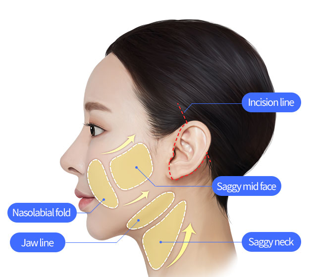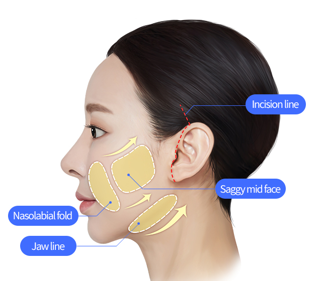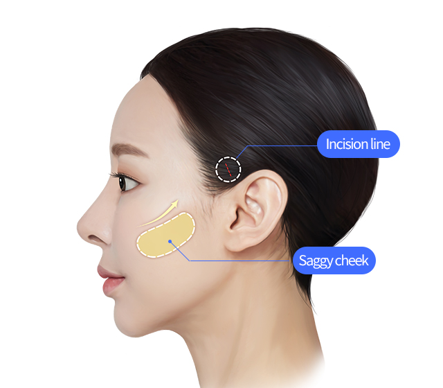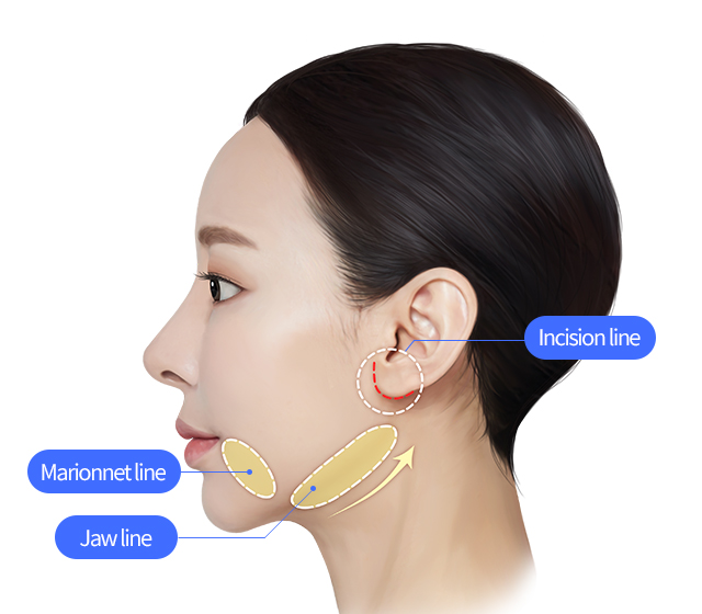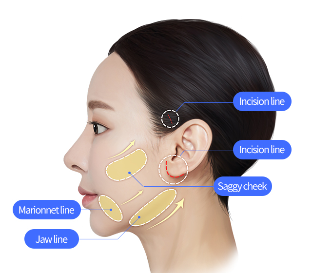 minimized incision on ear area to improve marionnet lines and saggy side cheek lines, this procedure is suitable for 20s to 40s who doesn't have much excess(sagging) skin