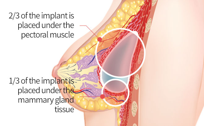 Dual-plane (double-plane) insertionThis method places the upper part of the implant under the pectoral muscle and the lower part above the muscle.