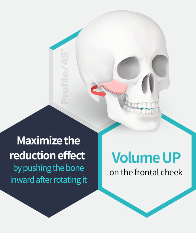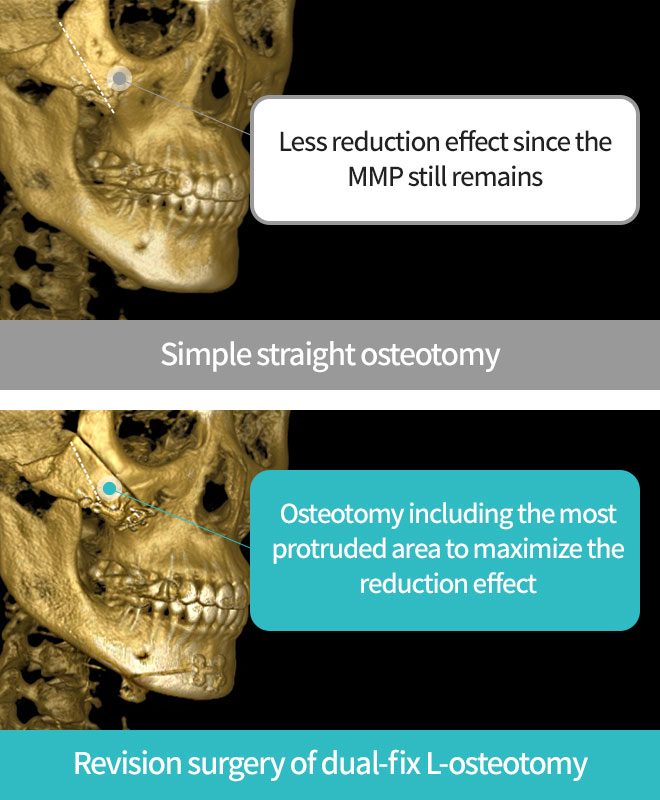Dual Fix reduction surgery doesn’t resect MMP point, osteotomy is performed delicately close to the eyes and resected bone is rotated and relocated through TS L Osteotomy method which prevents cheek sagging after surgery.