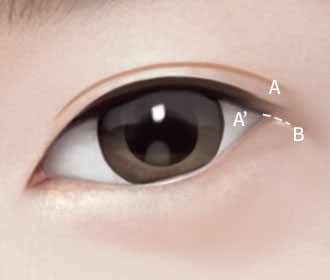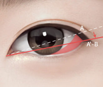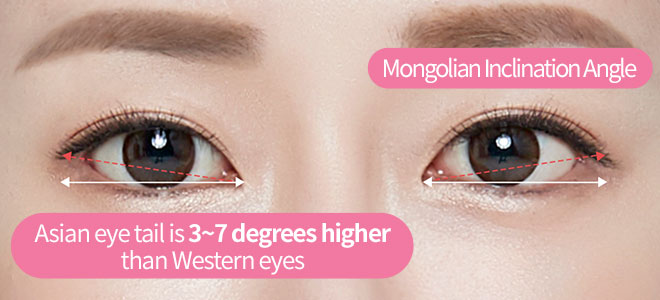 Normally, angle of the eyes is made by medial and lateral palpebral ligament. The angle this line makes with the horizontal line is called the inclination angle which is the standard for beautiful eyes. Generally inclination angle of Westerners is 5~8 degrees but Asians is about 10 degrees, this is called “ Mongolian inclination angle”