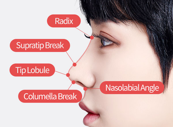 Columella Break~ Nasolabial AngleColumella break point that smoothly curves the line from the tip lobule and columella is important. In addition, the most ideal nasolabial angle for women is 90~110 degrees and for men 90~95 degrees.