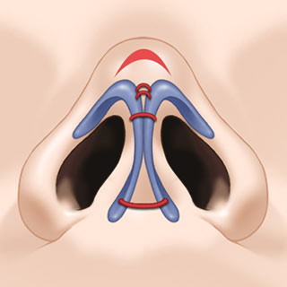An incision is made inside the nose to secure a space by separating alar cartilage and septal cartilage for new cartilage insertion.