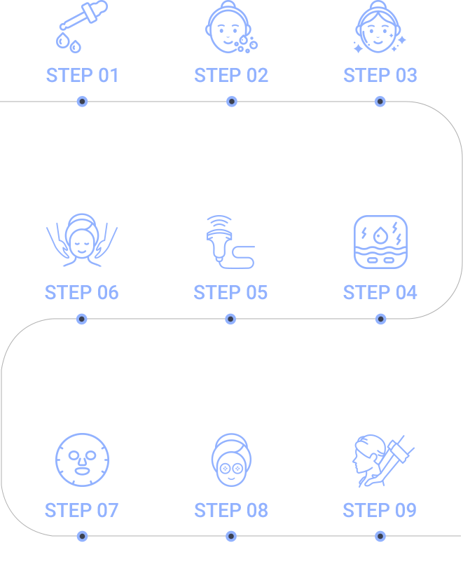 Program to make overall skin complexion brighter through point massage by hand and equipment therapy for rapid recovery and reduce swelling after eyes, nose surgery. Therapy is carefully carried out from exfoliation to moisturizing step and point massage effective in minimizing swelling.